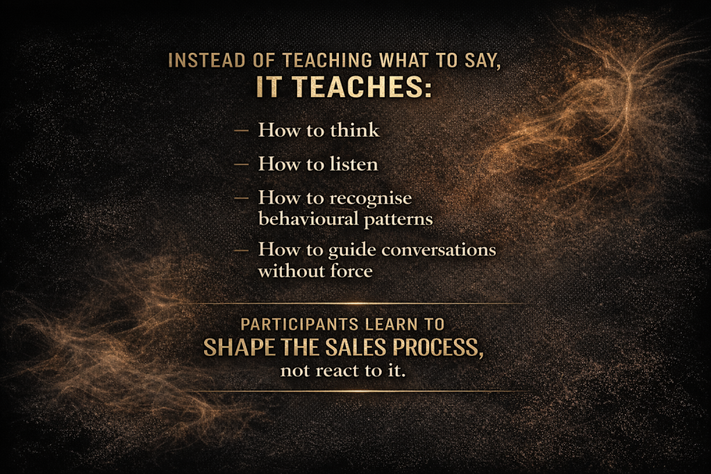 Modern buyers are informed, sceptical, and resistant to pressure. Scripts, closing tricks, and motivational hype no longer produce consistent results. The Method™ exists because sales has changed—and training needed to change with it.